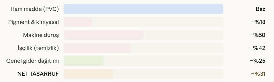 Tedarikçi için kablo maliyeti dört katmandan oluşuyordu: ham madde (bakır + PVC), doğrudan işçilik, makine çalışma süresi ve genel gider dağıtımı. Renk sadeleşmesinin her katmana etkisi farklıydı.