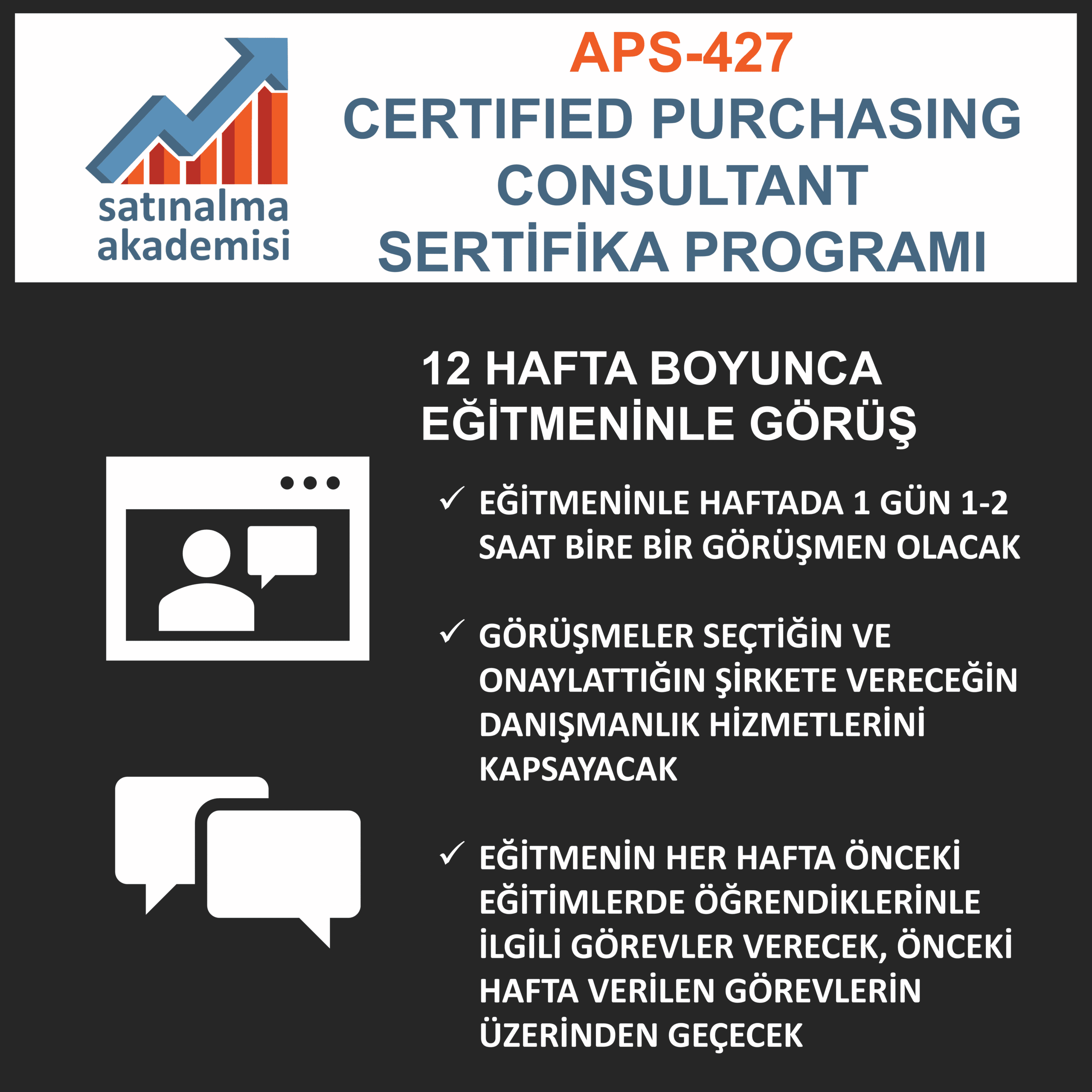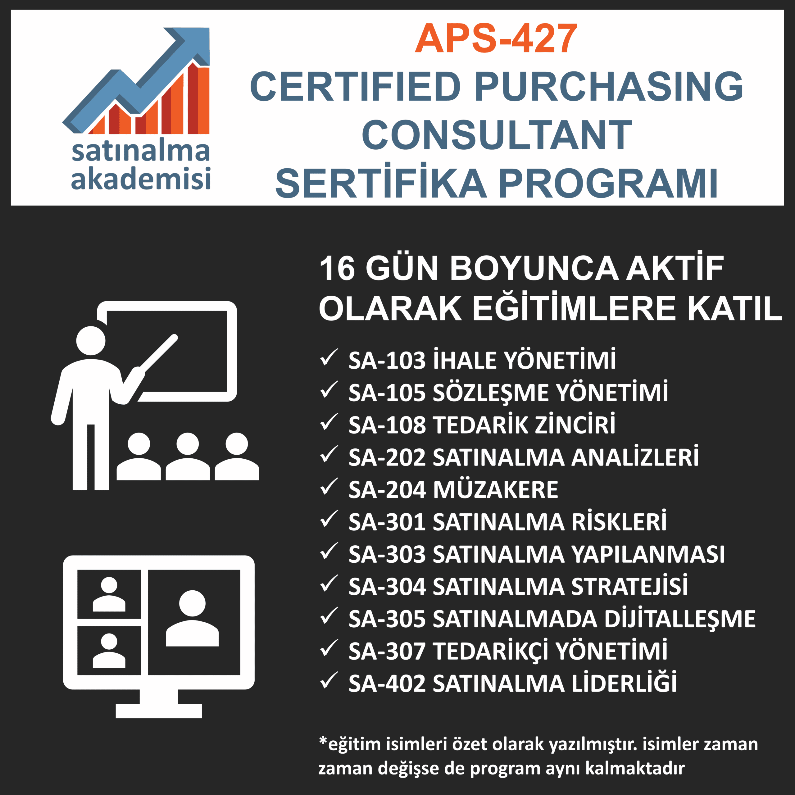 APS-427 Certified Professional Purchasing Consultant Sertifika Programı CPPC) bir satınalma yöneticisinin ihtiyaç duyacağı tüm yetkinlikler öngörülerek tasarlanmıştır. Program içeriğinde bulunan toplam 16 günlük 11 eğitim boyunca katılımcılar teklif toplama ve değerlendirme, sözleşmeler, tedarik zincirinin akışı ve satınalmanın etkisi, hesap ve analizler, etkili müzakereler, satınalma yapılanması, dijitalleşme, stratejiler, tedarikçi yönetimi, liderlik konusunda kendilerini geliştirirler ve tam donanıma sahip olurlar.